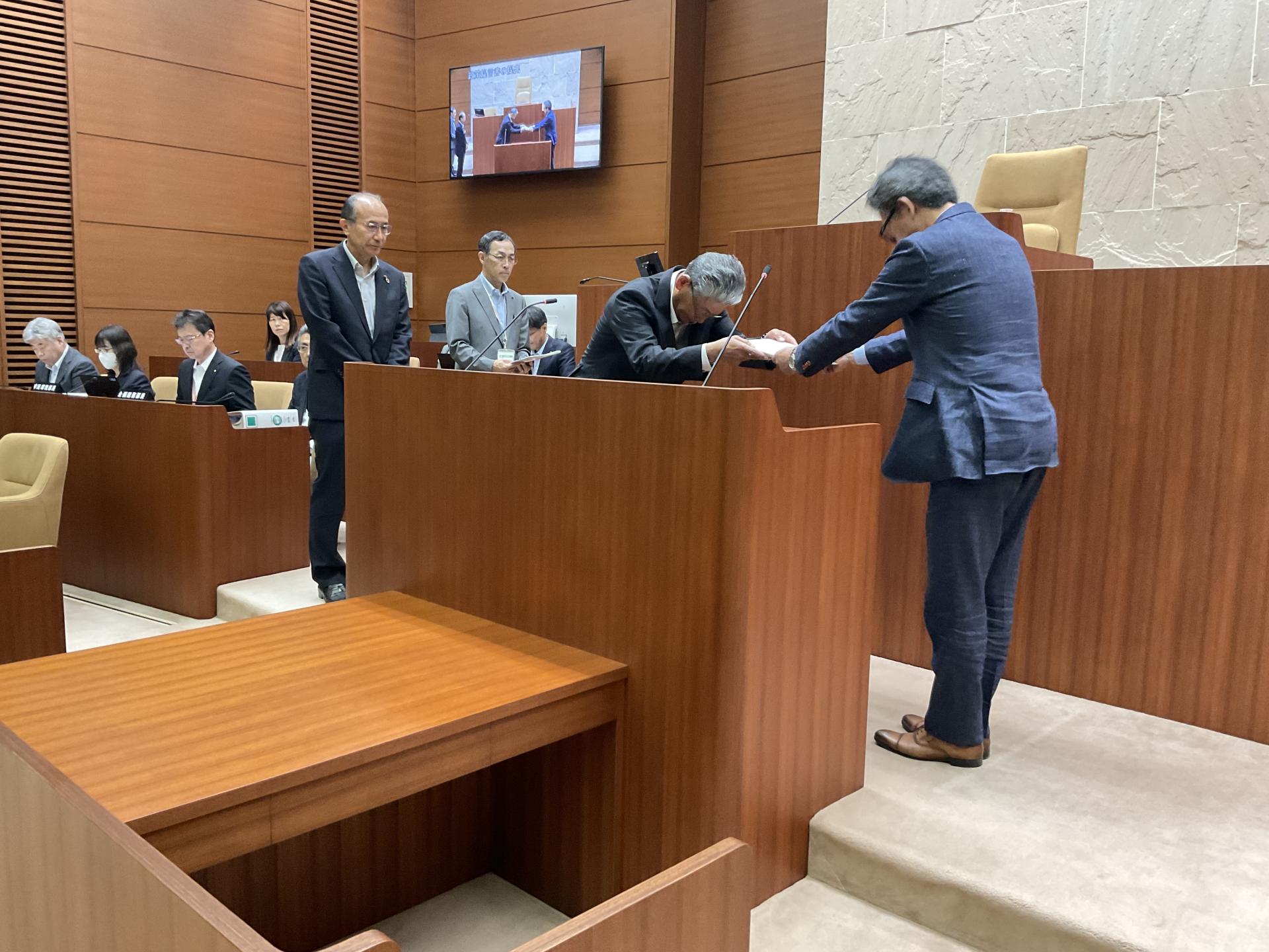 このたび、その調査結果を踏まえ、提言書「滝沢市に必要な医療体制」としてまとめ、令和5年6月23日に日向清一議長から武田哲市長に対し、提出しました。