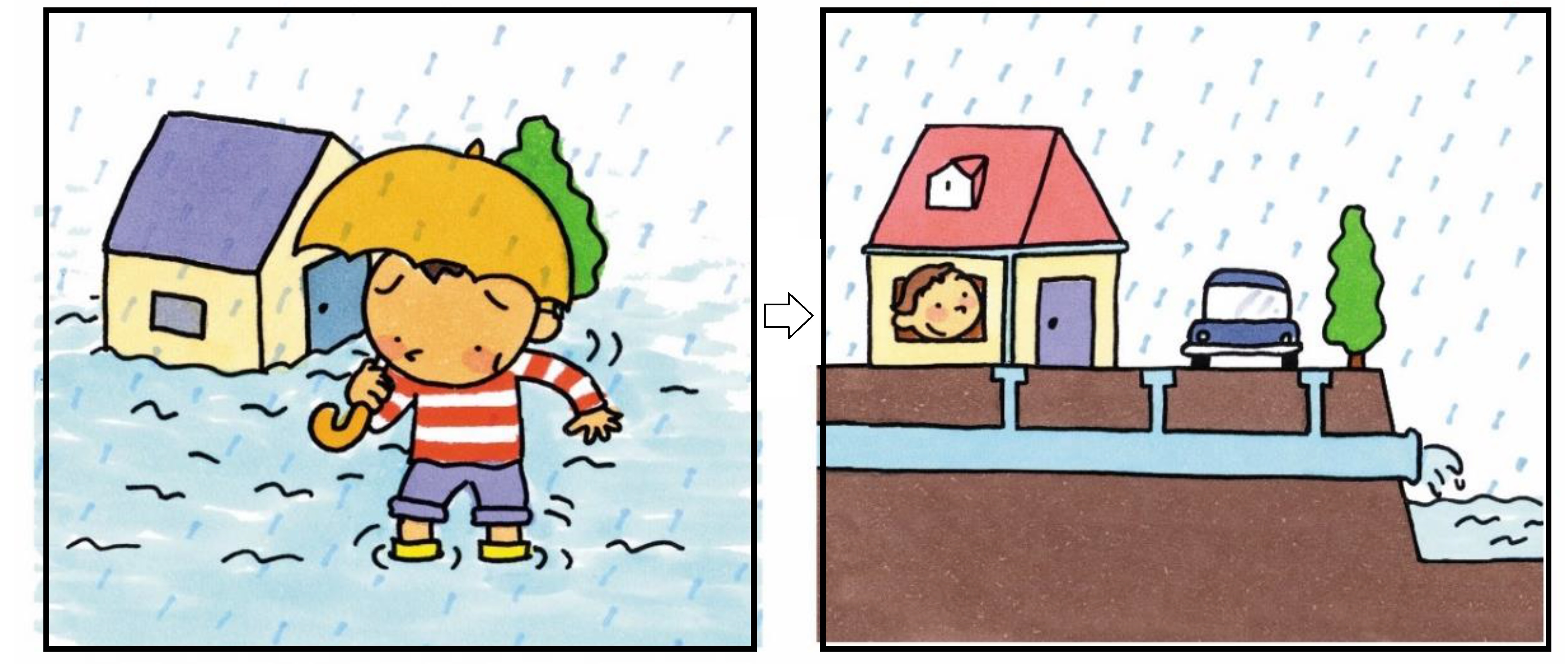 雨をすばやく雨水排水施設に集めて、街の浸水を守ります。