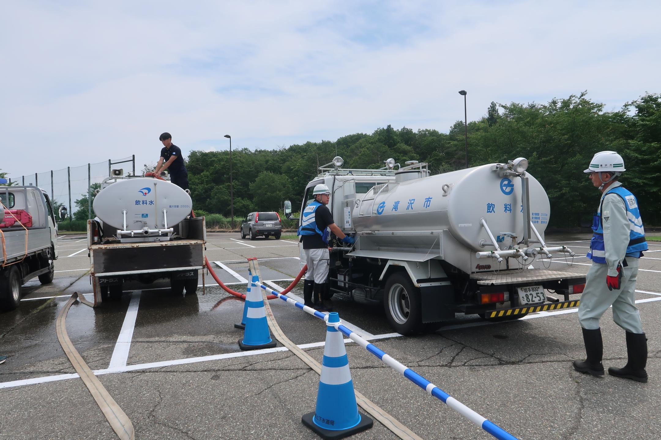 本市では、秋田県仙北市にある玉川浄水場に参集し、給水車へ注水後、給水活動場所である大仙市営大曲球場にて、大仙市給水車へ応急給水を実施しました。